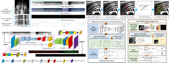 监控轨道交通受电弓实时安全状态和重要几何结构参数。采用深度学习理论,基于机器视觉技术去检测和测量位置结构,提高运维检测精度、自动化和智能化⽔平。